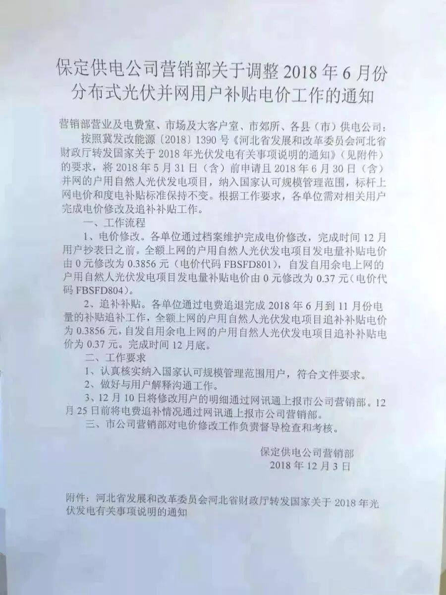 “光伏+交通”才是新能源汽车的崛起希望?日前,国家发展改革委员会、财政部、国家能源局联合发布了《关于2018年光伏发电有关事项说明的通知》,对531政策实施中的有关事项做了进一步说明。文件明确,在5月31日(含)前备案、6月30日(含)前并网的户用光伏项目,将被列入国家补贴支持的分布式光伏规模管理范围,标杆上网电价和度电补贴标准保持不变,可得到0.37元/kWh的财政补贴。 不过,政策发布后到落地执行仍需经过一段时间。从目前情况来看,部分地区电网并未及时作出调整,许多业主反映没有享受到相应的补贴。 2018年底已至,相关政策落地工作已经开始逐步推进。近期,部分地区电网已出台补贴调整措施,并将通知下发业主,目前山东省、湖南省、河北省保定市、浙江省德清县、广东省东莞市的补贴方案已经开始落实。 国网湖南省电力有限公司发布《关于光伏发电补贴调整执行的通知》,规定: 1、5月31日以后投入运行全额上网的执行补贴为0.70元/千瓦时; 2、5月31日以后投入运行的自发自用余电上网的补贴为0.32/千瓦时; 3、扶贫电站补贴不变; 4、5月31日前备案开工建设并6月30日并网并纳入国家认可范围的执行全额0.75元,自发自用0.73元。 山东电网公司发布《关于落实发改能源〔2018〕1459号文的通知》,明确2018年5月31日(含)之前已备案、开工建设,且在2018年6月30日(含)之前并网投运的合法合规的户用自然人分布式光伏发电项目标杆上网电价和度电补贴标准保持不变。补贴标准为: 1、“全额上网”模式上网电价每千瓦时0.75元(含税); 2、“自发自用、余电上网”、“自发自用”模式上网电量每千瓦时0.3949元(省燃煤标杆上网电价),按发电量每千瓦时补助0.37元。 《保定供电公司营销部关于调整2018年6月份分布式光伏并网用户补贴电价工作的通知》已经正式公布,2018年5月31日(含)前申请且2018年6月30日(含)并网的户用自然人光伏发电项目纳入国家规模管理范围。《通知》两点重要内容: 1、电价修改:全额上网的户用自然人光伏发电项目发电量补贴电价由0元修改为0.3856元,加上当地脱硫燃煤电价,总共是0.75元/度。自发自用余电上网的户用自然人光伏发电项目发电量补贴电价由0元修改为0.37元。 2、追补补贴:各单位通过电费追退完成2018年6月到11月份电量的补贴追补工作,完成时间12月底。 虽然国家已经明确2018光伏补贴政策,但在备案时间的确认问题上出现了许多争议,保定是全国首个明确以申请时间为备案时间的地区,同时对补贴申请条件也有所放宽,明确补贴追补工作时间完成节点也是对用户权益的进一步明确和保障。 据德清新闻网报道,该县在国家政策及浙江省光伏补贴政策的前提下,确定县级补贴政策: 家庭屋顶光伏发电项目:按装机容量给予一次性1元/瓦补贴,最高不超过10000元,补贴投资方,不享受县级发电量奖励。 工商业分布式光伏发电项目:除按政策享受国家、省有关补贴外,按其年发电量给予0.1元/度的补贴,自发电之日起,连续补贴三年,补贴投资方。 据业内同行透露,广东省东莞市也明确2018年5月31日后并网的光伏用户已恢复垫付国家补贴。 有媒体致电东莞电网核实光伏补贴标准,答复如下: 1、自发自用余电上网:按0.32元/度(税前)垫付,扣税后,业主拿到手的金额是0.2759元/度。 2、全额上网:按0.7元/度(税前)垫付,扣税后,业主拿到手的金额是0.6216元/度。 目前上述五个地区已经开始明确过渡期补贴政策,期待更多地区电网公司落实补贴相关事宜,让广大光伏业主吃下定心丸。
