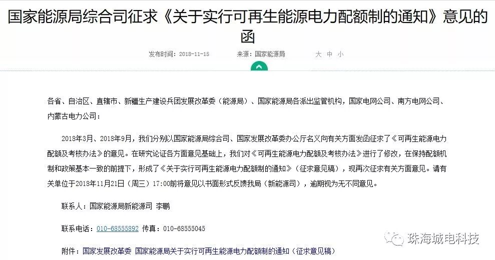 明年1月耗电大户必须承担绿电 配额换补贴刚刚,国家能源局发布了征求《关于可再生能源电力配额制的通知》意见函。伏妹儿帮大家解读一下。 1.每年1月底前各省上报指标,3月底前国家下达指标。 2.必须要承担配额的有两类:第一类为各类直接向电力用户供电的电网企业、独立售电公司、拥有配电网运营权的售电公司(简称配售电公司);第二类为通过电力批发市场购电的电力用户和拥有自备电厂的企业。 3.配额可通过转让、购买绿证来完成。向超额完成年度配额的市场主体购买其超额消纳的可再生能源电量实现,双方自主确定转让价格。自愿认购可再生能源电力绿色证书(简称“绿证”),绿证对应的可再生能源电量等量记为配额完成量。 4.执行时间:2019年1月1日 跟户用光伏有关系么? 1.有利于各省推动光伏的发展,尤其是配额高的省。其中,户用、工商业、公共机构等是重点。 2.加速可再生能源市场化交易,户用参与电力交易指日可待。 户用如何参与电力交易呢?可以戳《重磅 可再生能源配额制再次征求意见》,《两部委:别老想着拿补贴,卖电也能赚钱》 如果大家对于这个配额制有任何建议,都可以在2018年11月21日(周三)17:00前将意见以书面形式反馈给国家能源局(新能源司)。 联系人:国家能源局新能源司 李鹏 联系电话:010-68555892 传真:010-68555045 文件原文如下: 国家发展改革委 国家能源局关于实行 (征求意见稿)